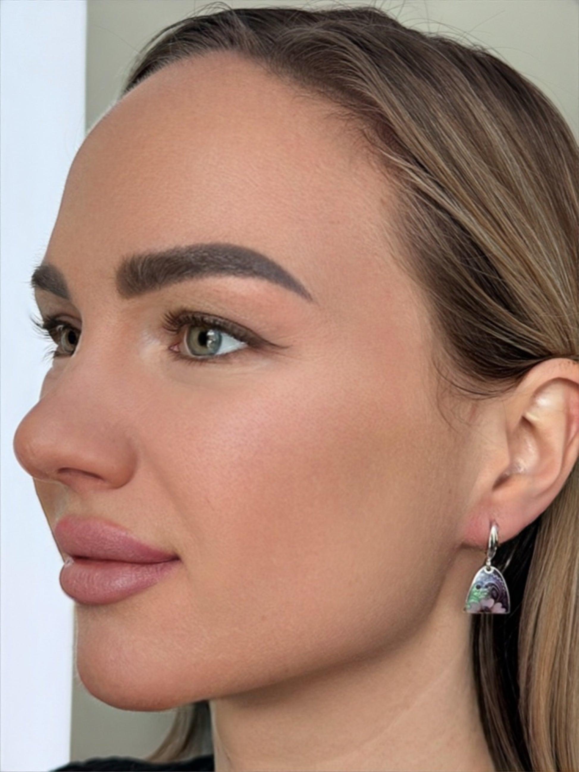 Need ekspressiivsed Minanqari kõrvarõngad on õrna lillelise kompositsiooniga pehmetes violetsetes, värsketes rohelistes ja mahedate pastelsetes toonides. Voolav joon ja kihiline värvus loovad rahuliku liikumise tunde, meenutades vaiksel niidul õitsevaid lilli.