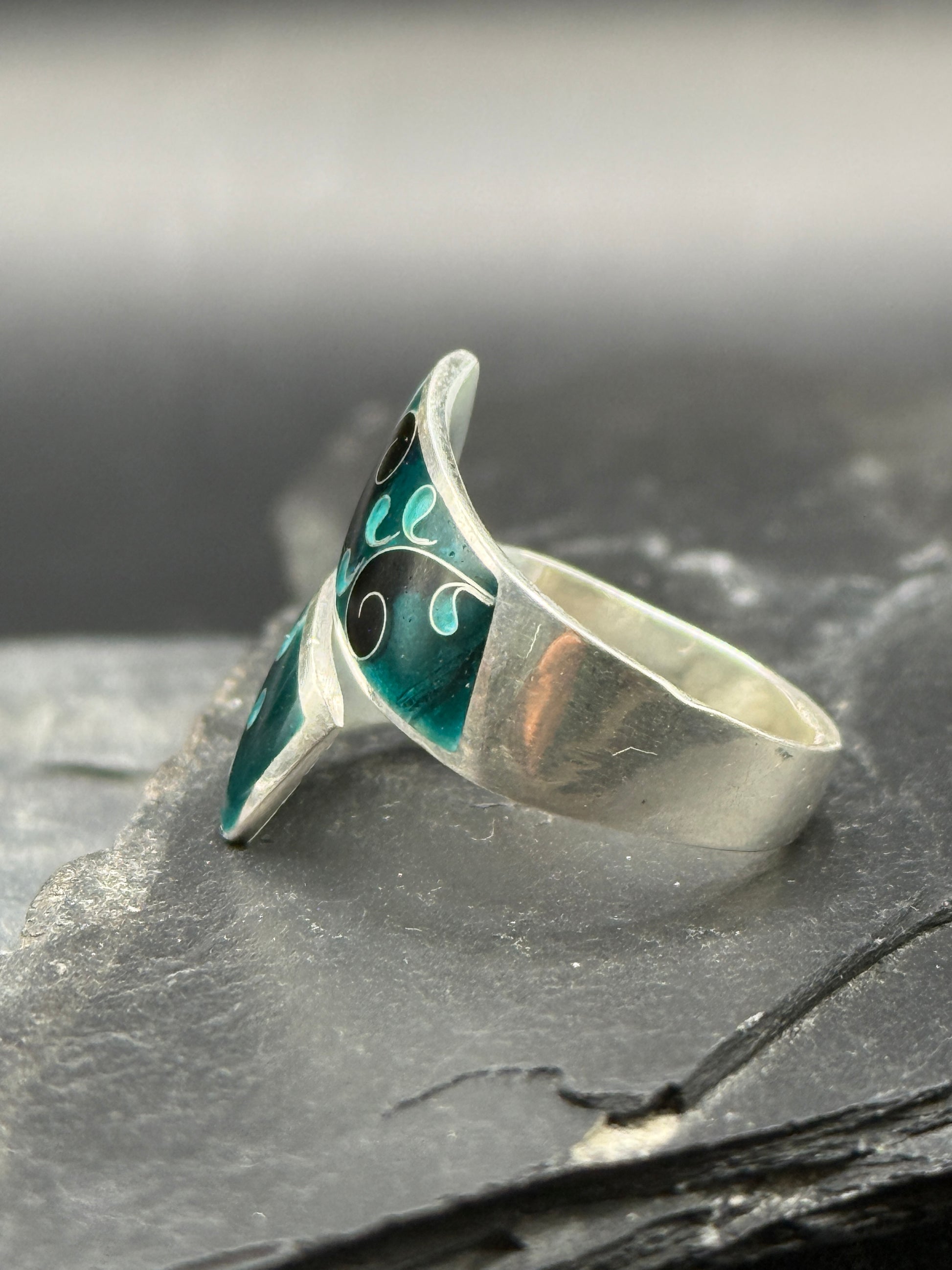 Hõbedast ja käsitsi maalitud emailiga sõrmus peegeldab smaragdroheliste toonide ja elegantsete lainemotiivide kaudu ookeani voogu ja elujõudu.
