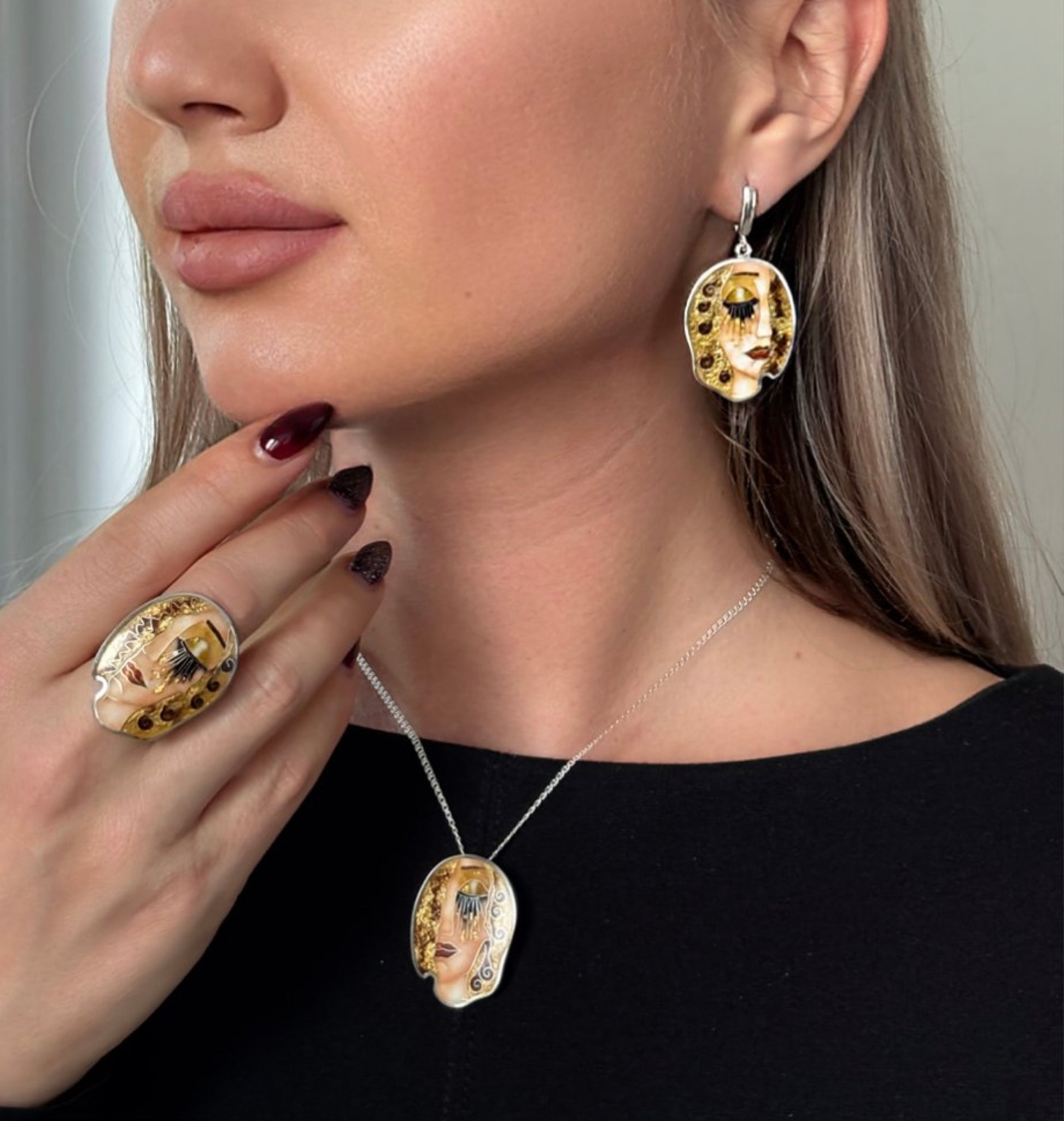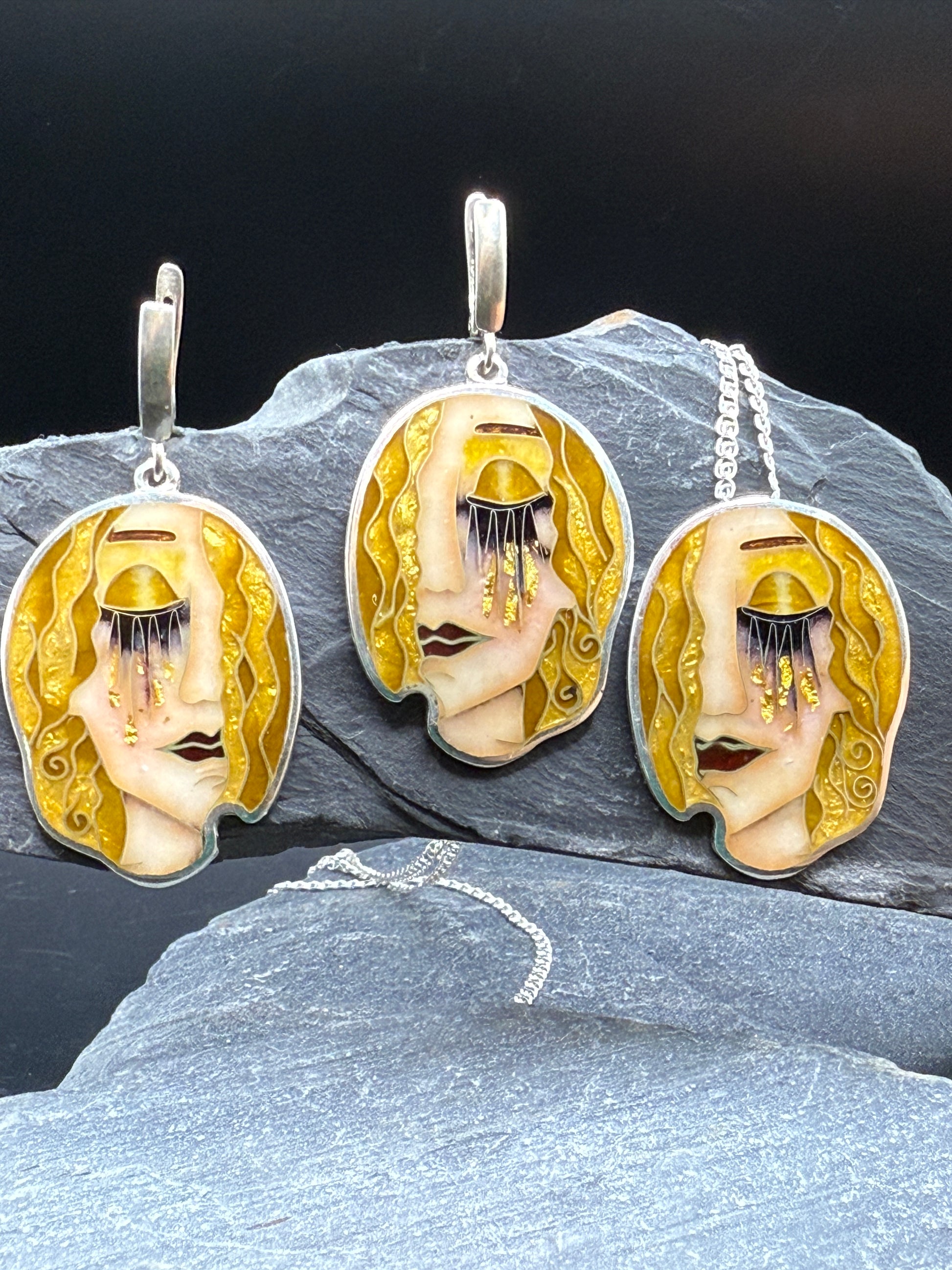 See elegantne komplekt – ripats ja kõrvarõngad – on inspireeritud Gustav Klimti loomingust. "Kuldsed pisarad" , mis on ellu äratatud iidse Minanqari emailitehnika abil.