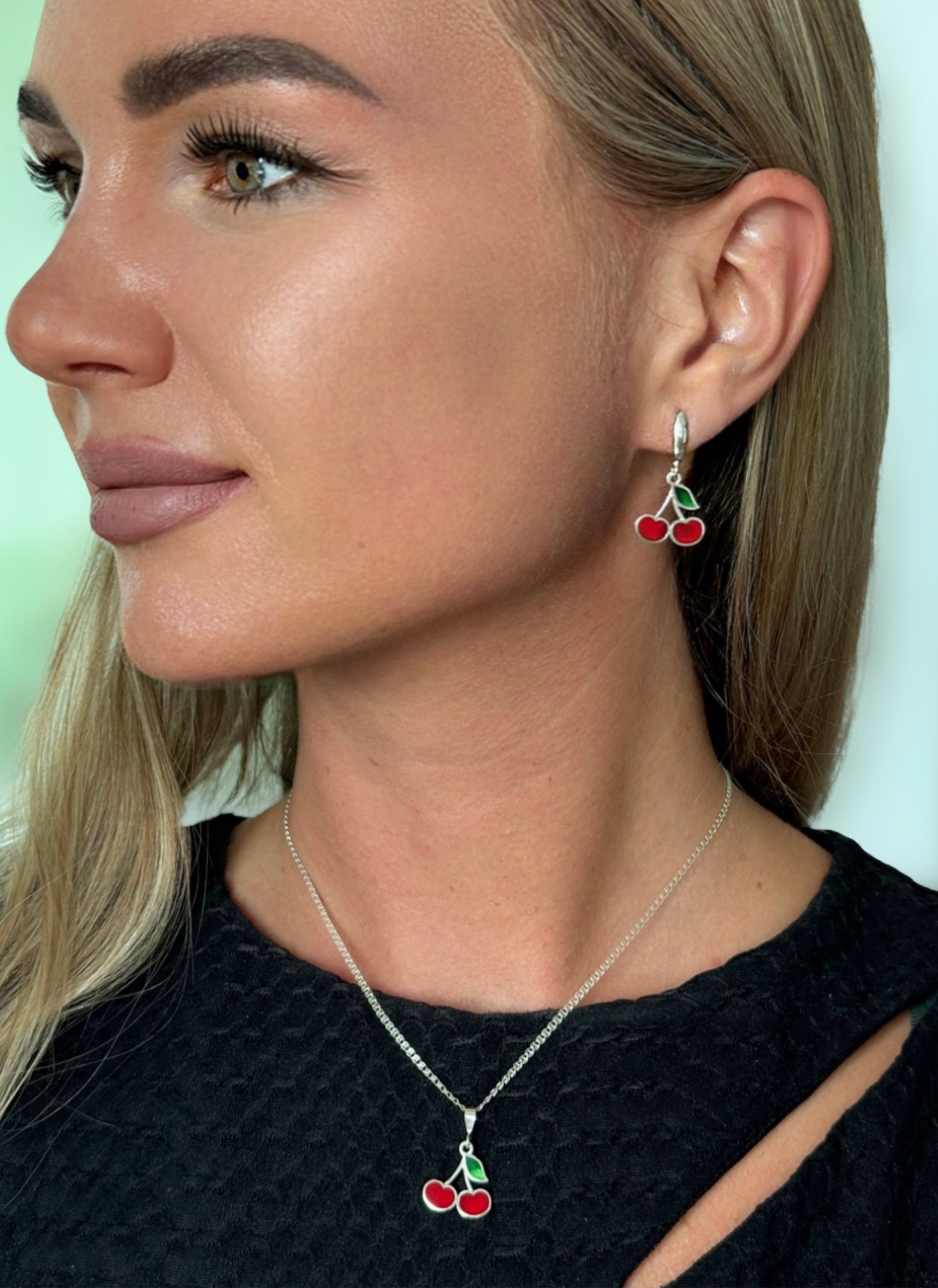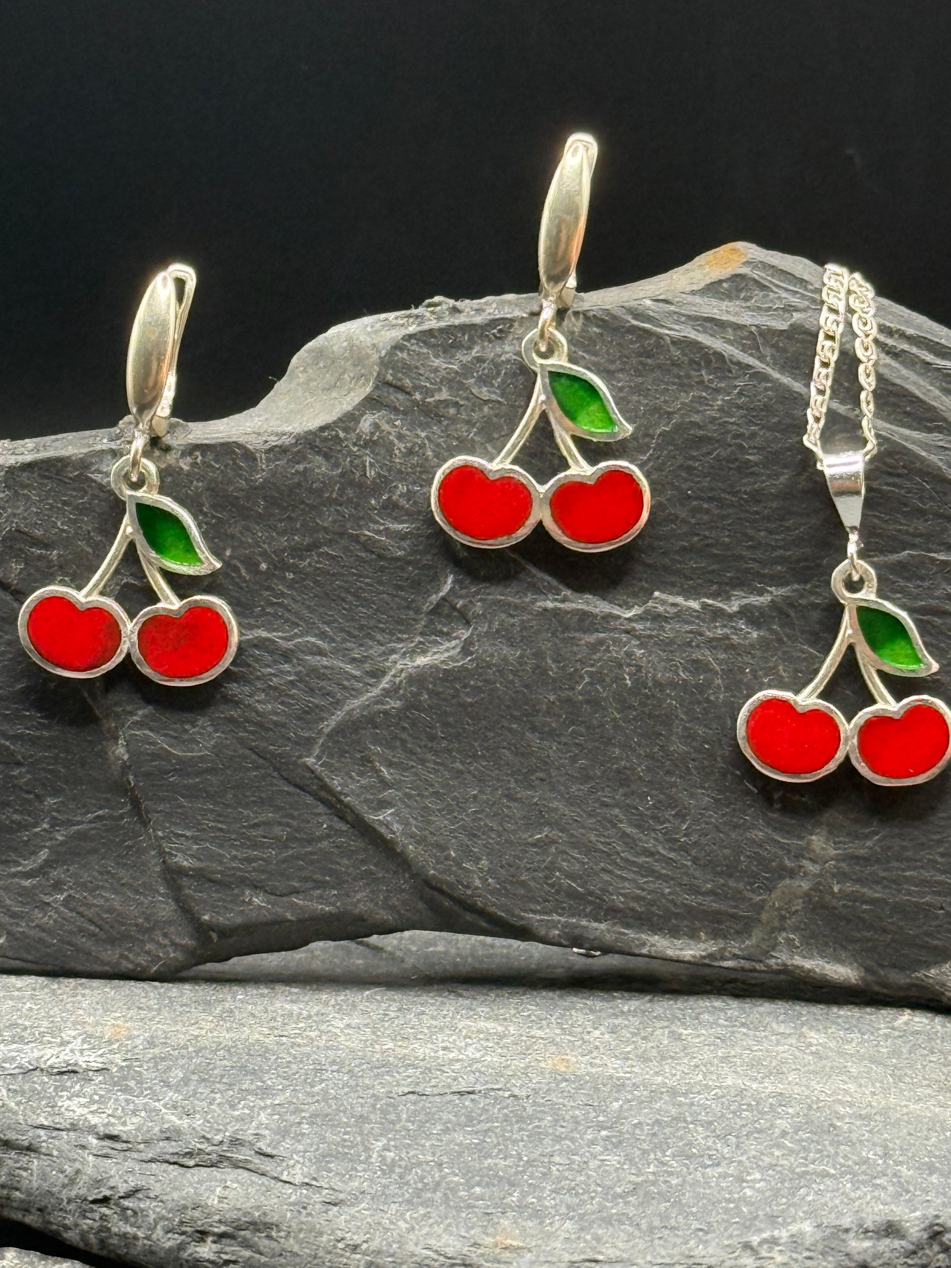 Mänguline ja sümboolne ehtekomplekt, millel on kujutatud erkpunaseid kirsse.
