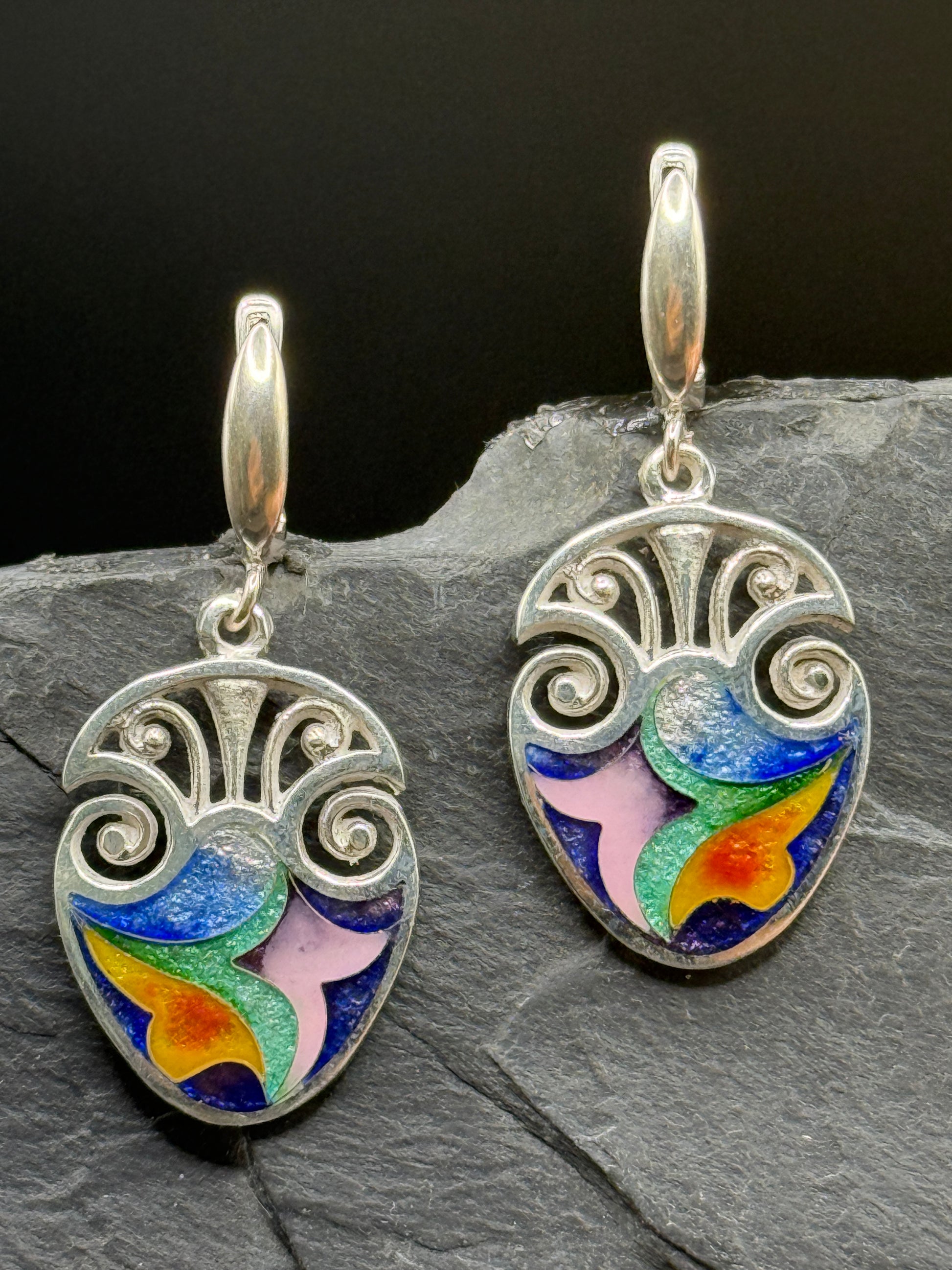 These elegant earrings combine flowing silver lines and vibrant enamel colors in a perfect harmony of art and craftsmanship. Inspired by natural forms and Art Nouveau patterns, they radiate sophistication and joy.