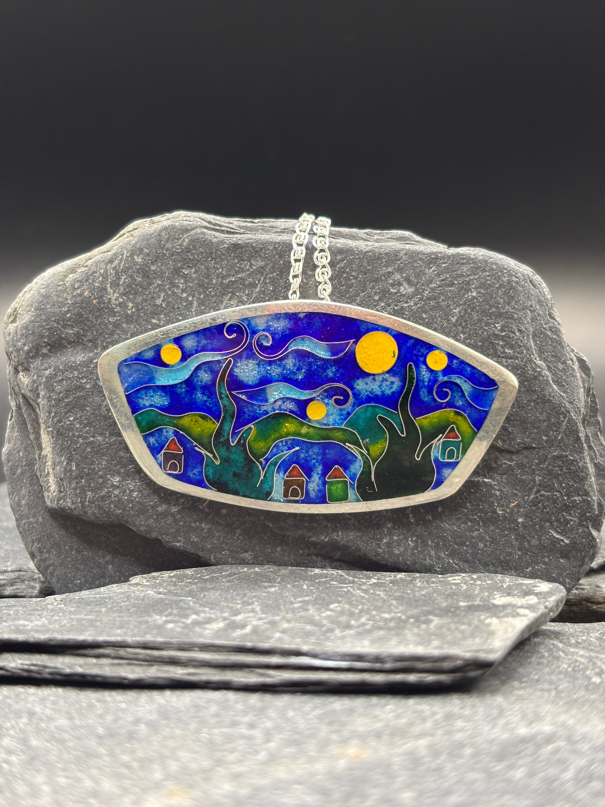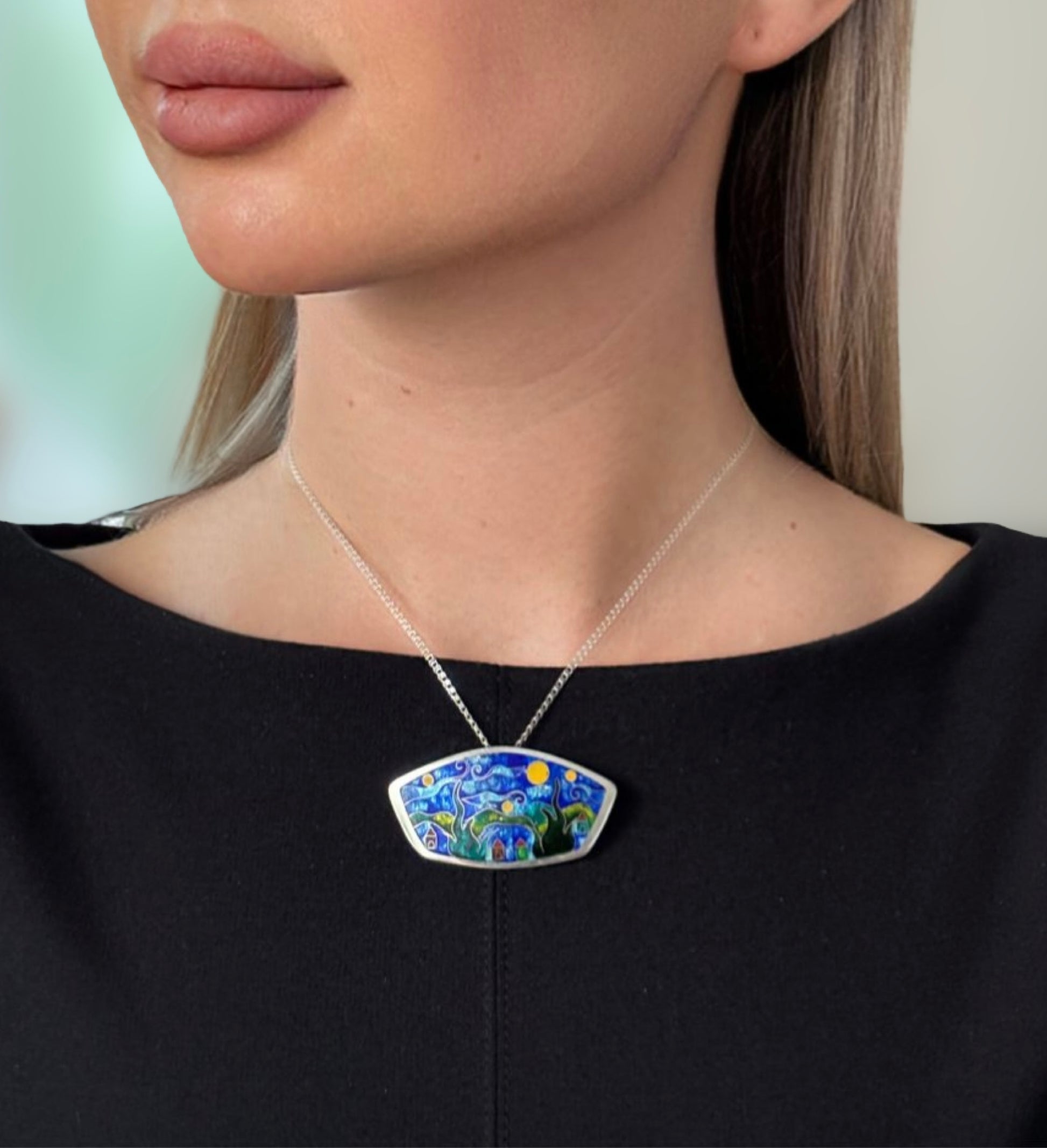 Inspired by Vincent van Gogh’s iconic "Starry Night," this pendant beautifully recreates the swirling night sky in vivid colors, showcasing the essence of the masterpiece. Using the ancient Minanqari enamel technique, each pendant is carefully crafted to capture the energy and depth of Van Gogh's vision.