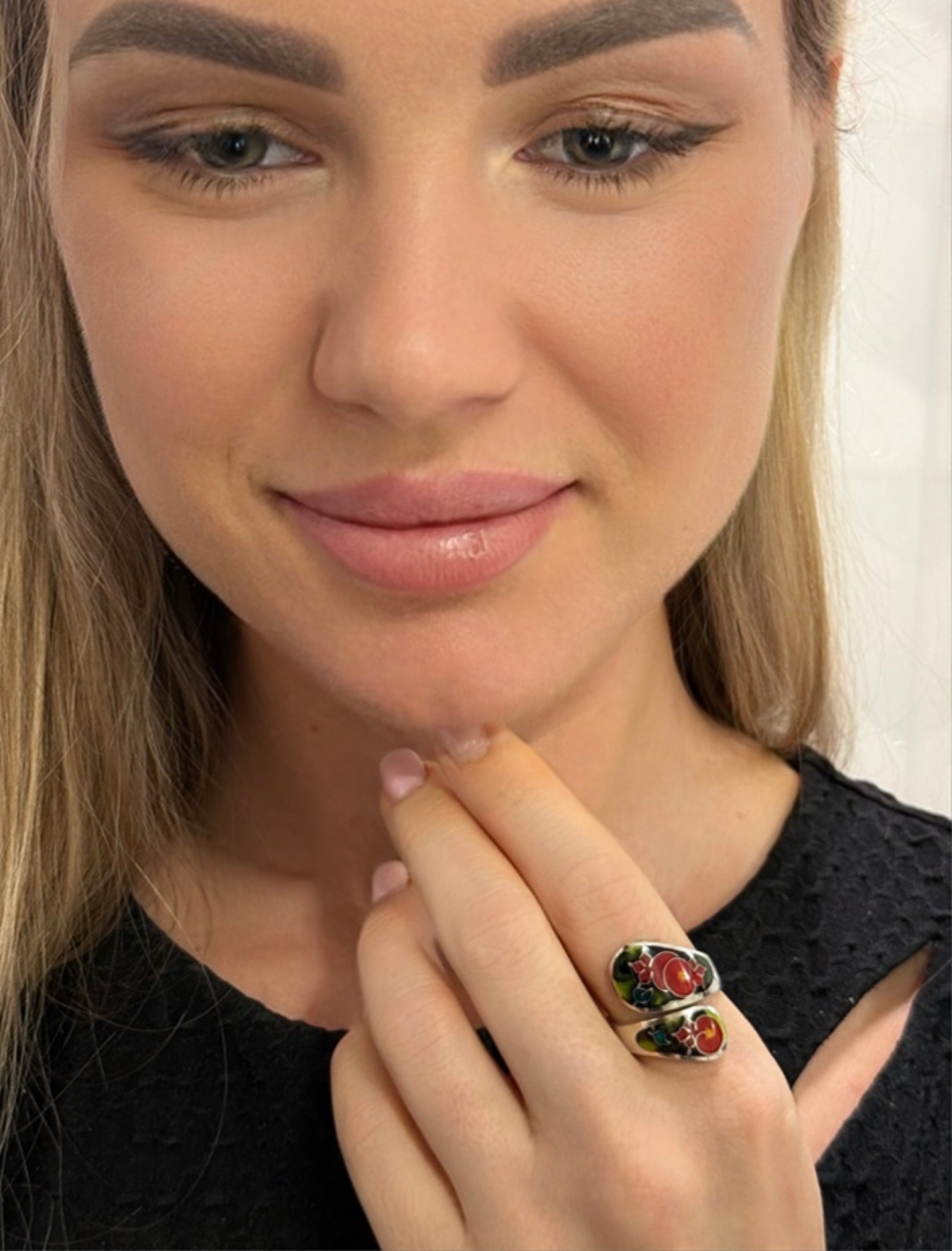 Handcrafted in sterling silver and hand-painted with rich red, deep green, and black enamel, this piece represents life, abundance, protection, and continuity. The spiral composition enhances the sense of movement and eternity, while the glossy enamel surface reflects light beautifully.