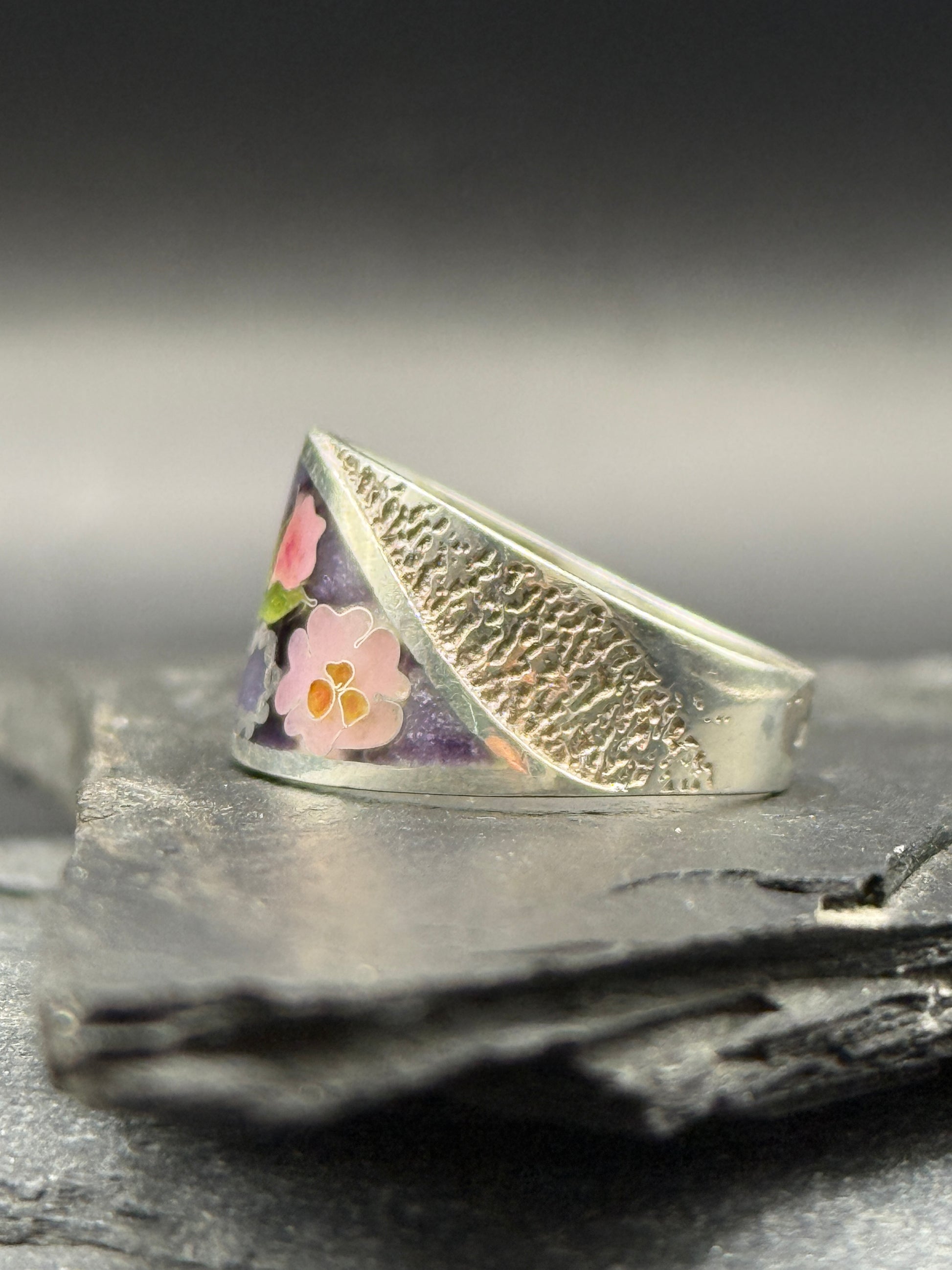 A delicate silver ring featuring hand-painted enamel flowers in soft pink shades against a deep violet background. Crafted in Georgia using the ancient Minankari (hot enamel) technique, this piece captures the beauty of spring blossoms in timeless jewelry art.