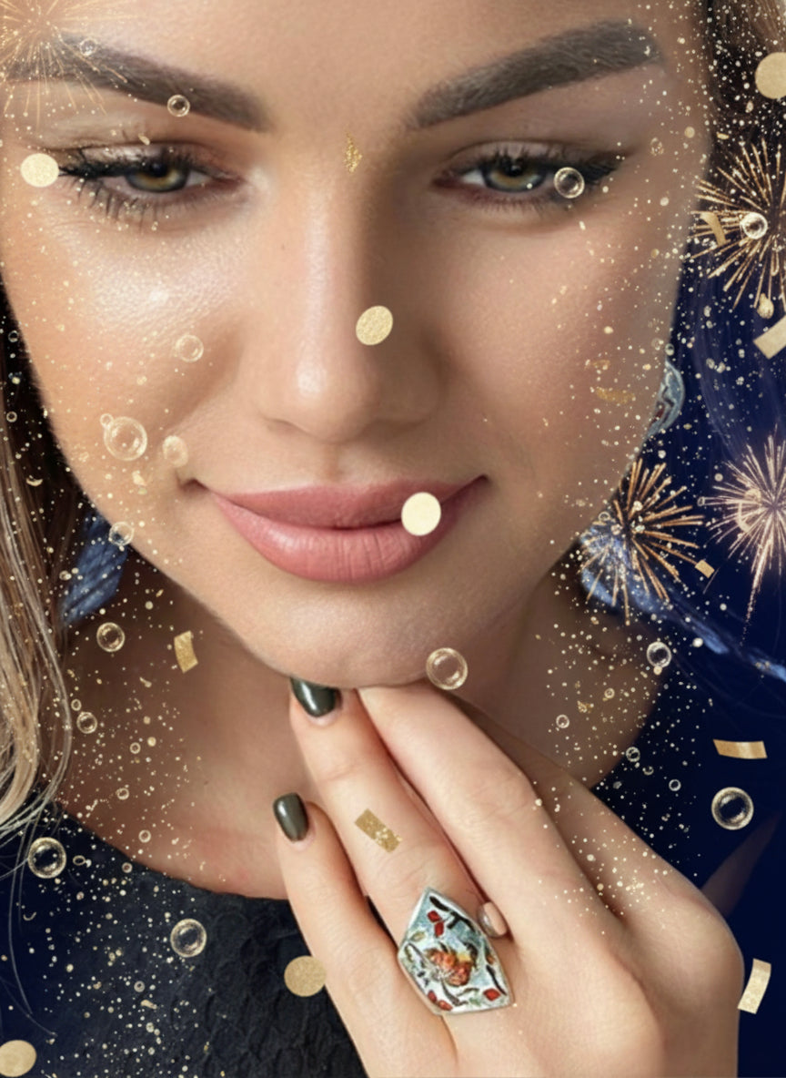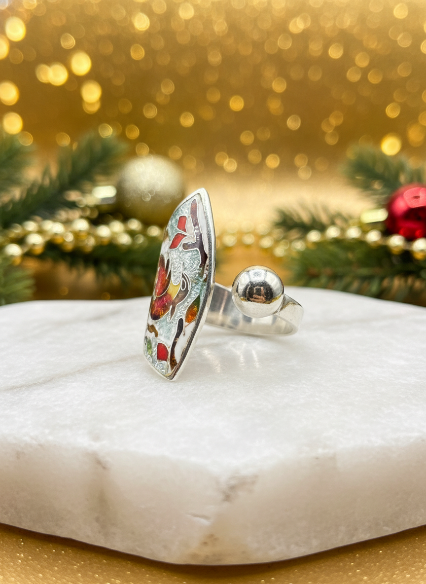 Each line and color is created by hand using the ancient Georgian Minanqari (Cloisonné Enamel) technique, where glass powder and silver merge in fire to create luminous, eternal This ring sings of stillness, warmth, and the beauty found in cold days.