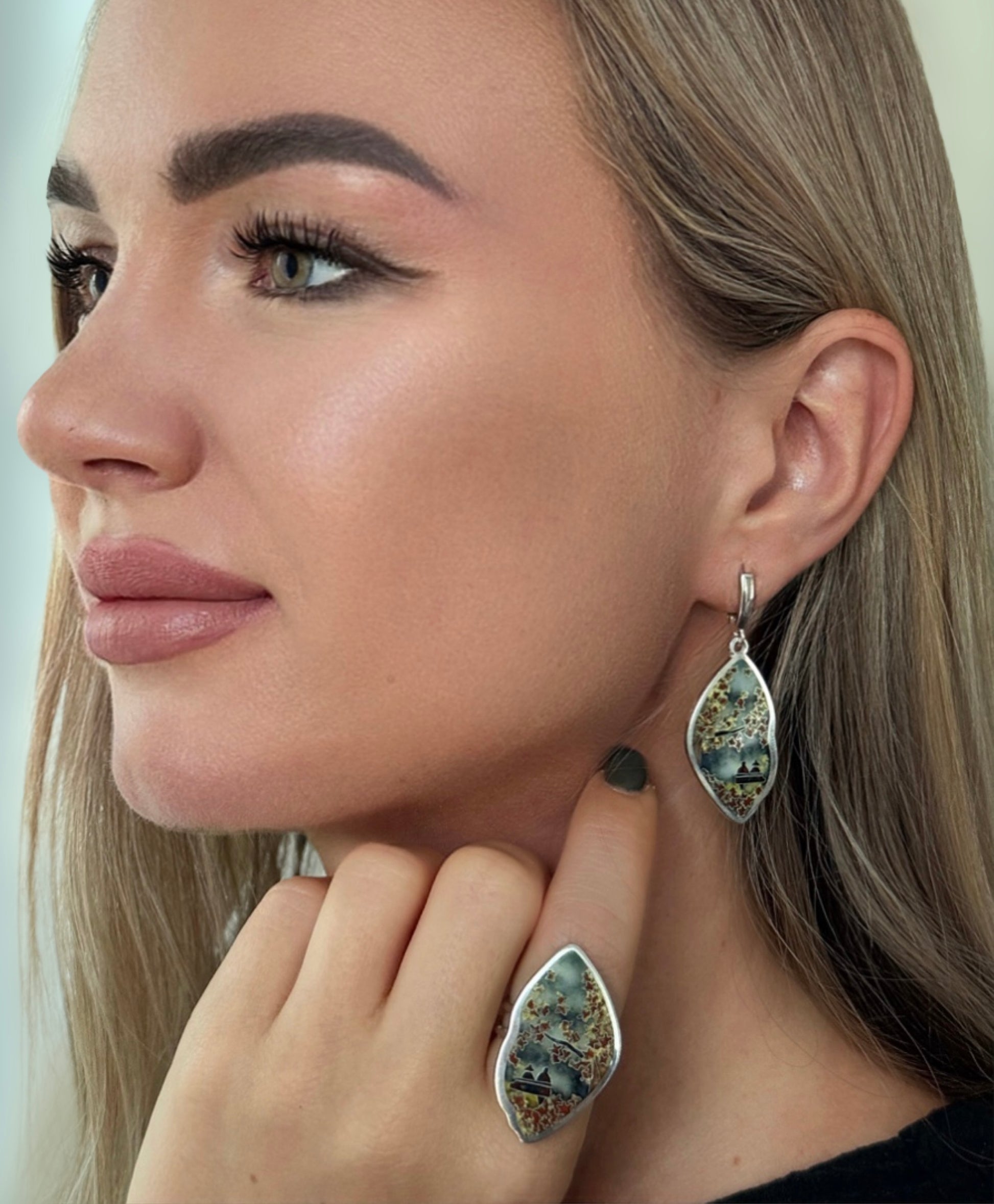 This enchanting jewelry set captures the quiet beauty of autumn — golden leaves drifting through the sky above a peaceful village. Inspired by nature and crafted with the ancient Georgian Minanqari technique, each piece is a miniature landscape of warmth and nostalgia.