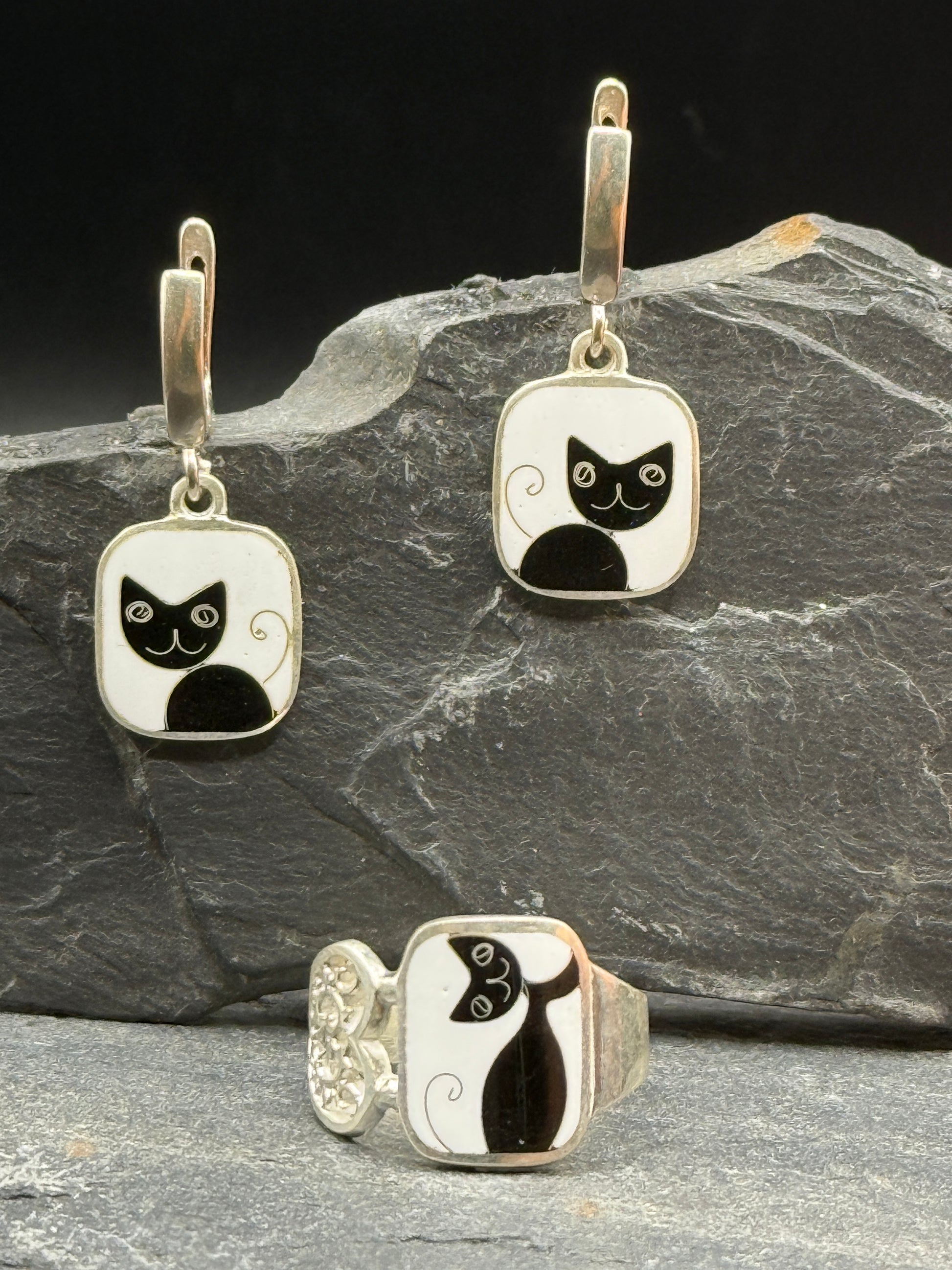 The silver ring and earrings feature hand-painted cats in the ancient Georgian Minanqari enamel technique. Each piece carries warmth, character, and a touch of whimsy — a perfect gift for yourself or someone special.