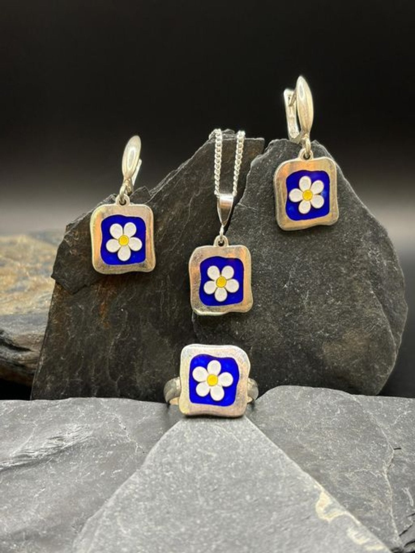 Brighten up little moments with this charming children's jewelry set — a trio of ring, pendant, and earrings that captures the joy of simple design and ancient craftsmanship. Each piece features a cheerful white flower blooming on a rich blue enamel background, lovingly handcrafted using the traditional Georgian Minanqari (cloisonné enamel) technique.