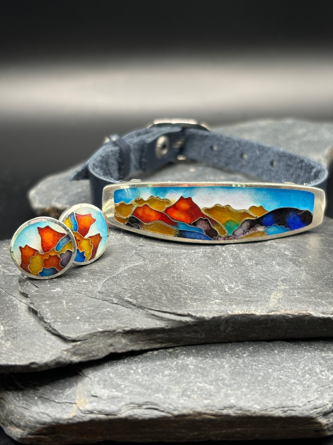 Material: sterling silver, enamel, leather.