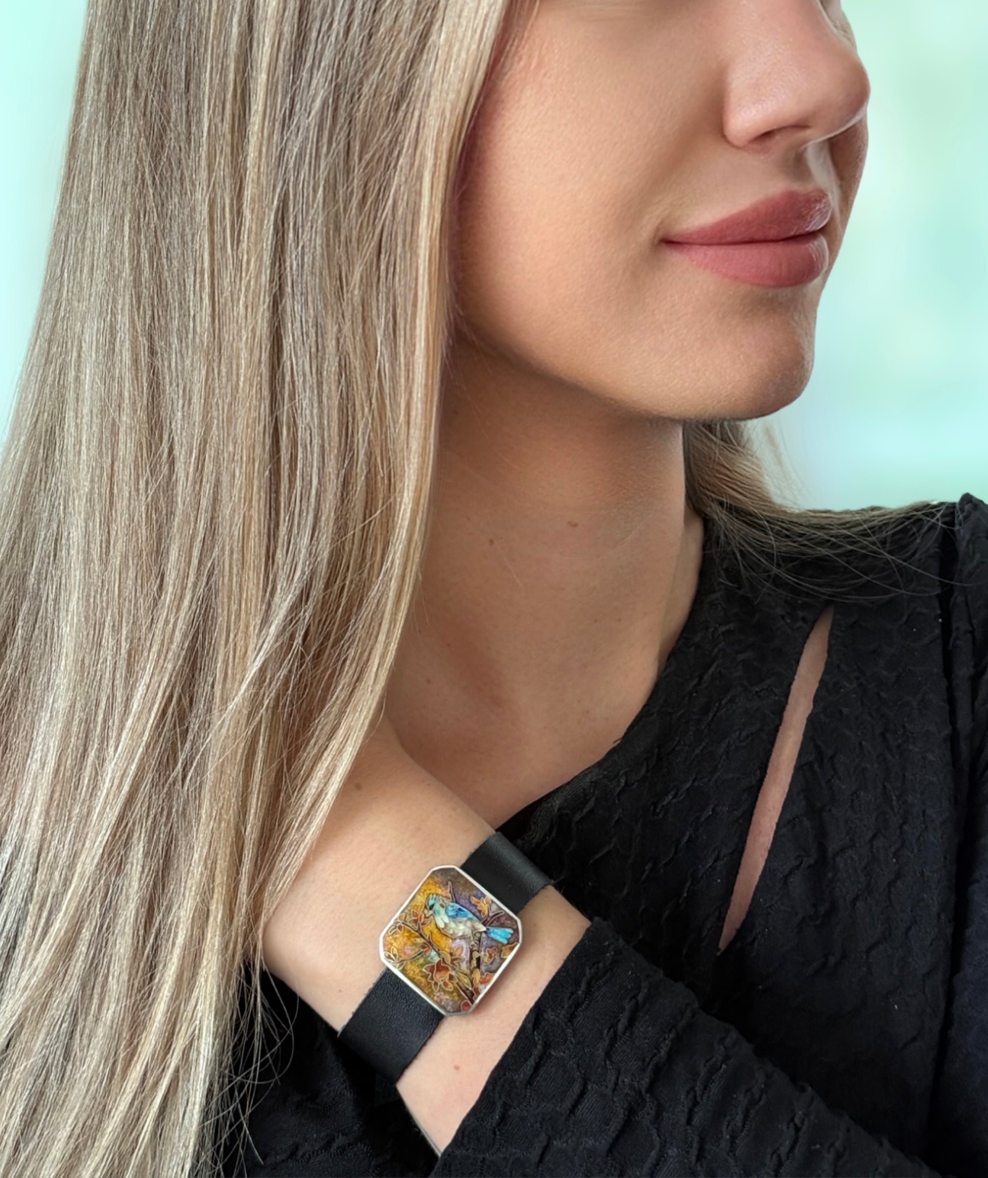Каждый штрих цвета — от золотого фона до небесно-голубых перьев — сплавлен в огне, делая каждое изделие поистине уникальным. Ремешок из натуральной кожи добавляет этому поэтичному произведению искусства современный, земной баланс.