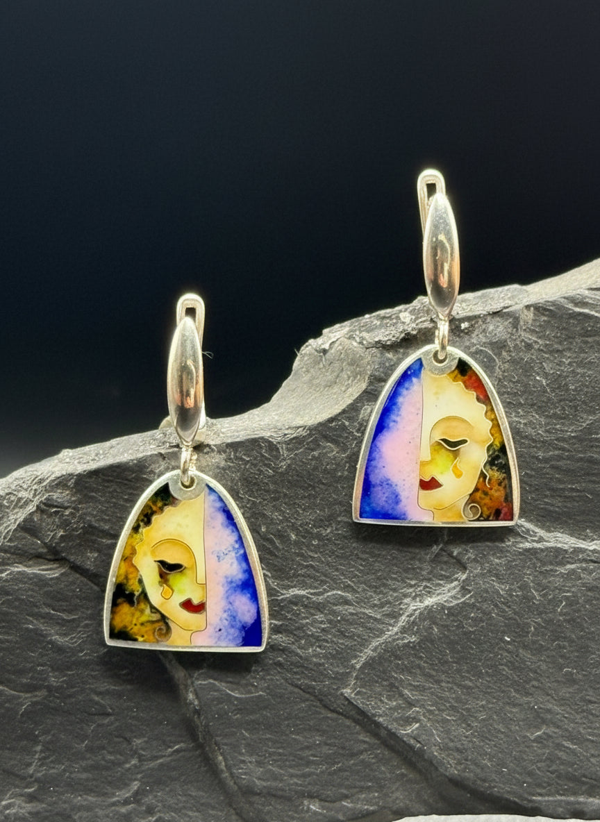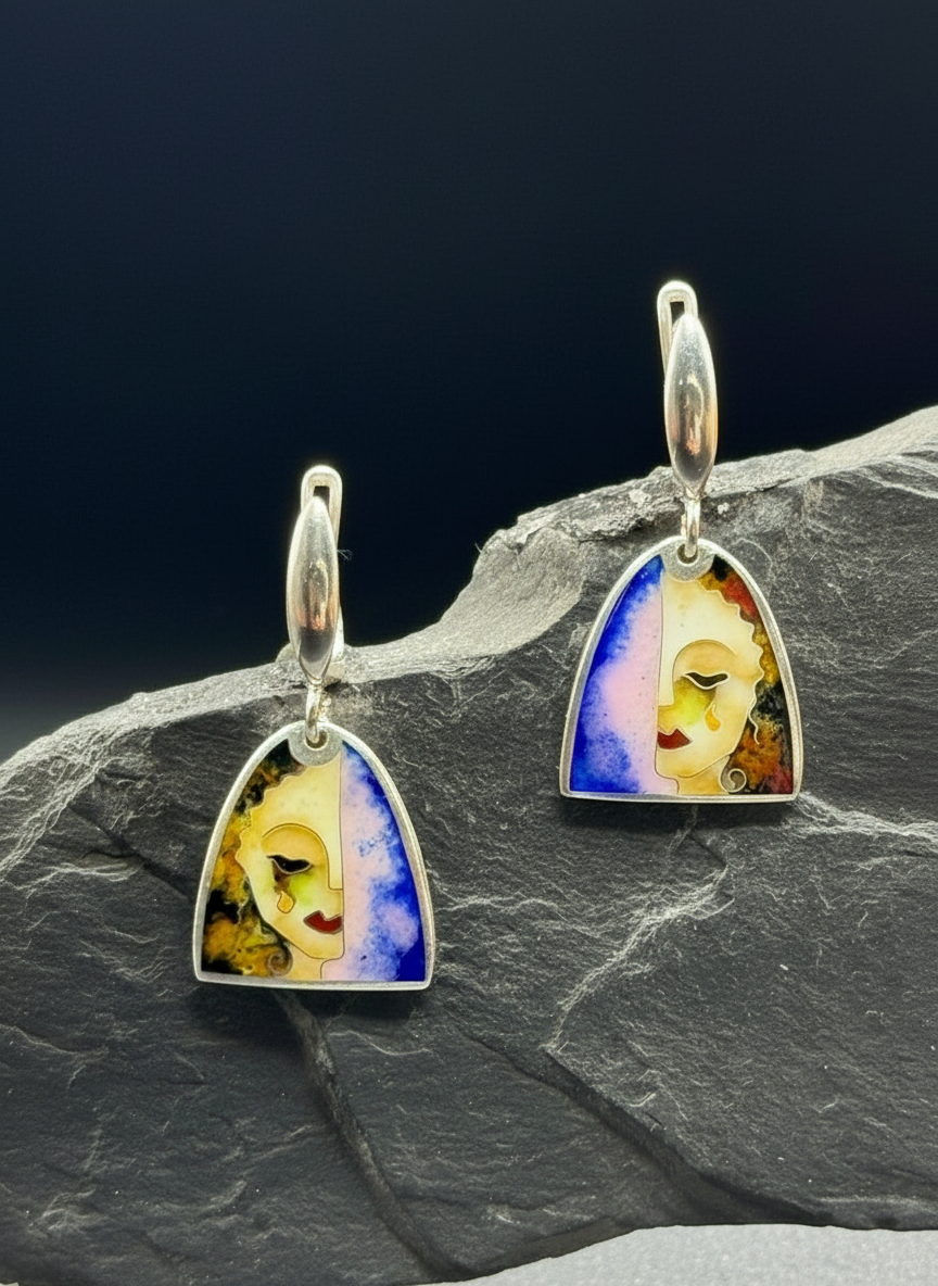 Каждая серьга изображает изящное женское лицо, наполовину омытое золотистым светом, наполовину переходящее в глубокие кобальтовые и нежные сиреневые тона. В результате получается миниатюрное произведение искусства, наполненное символизмом, эмоциями и художественной красотой.