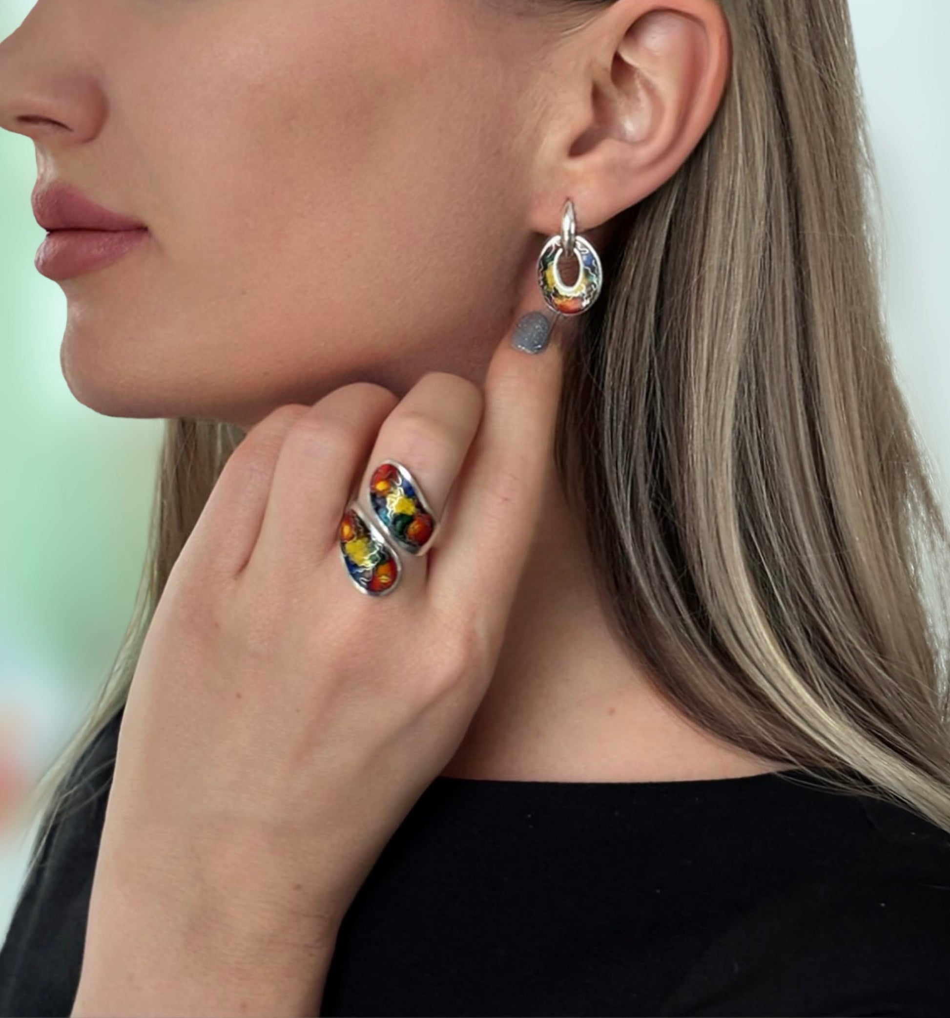 Изящные мазки эмали, переливающиеся на серебряных поверхностях, передают свет, цвет и движение импрессионистского сада Моне. Каждое изделие изготавливается вручную с мастерством и любовью, превращая серьги в миниатюрные произведения искусства.