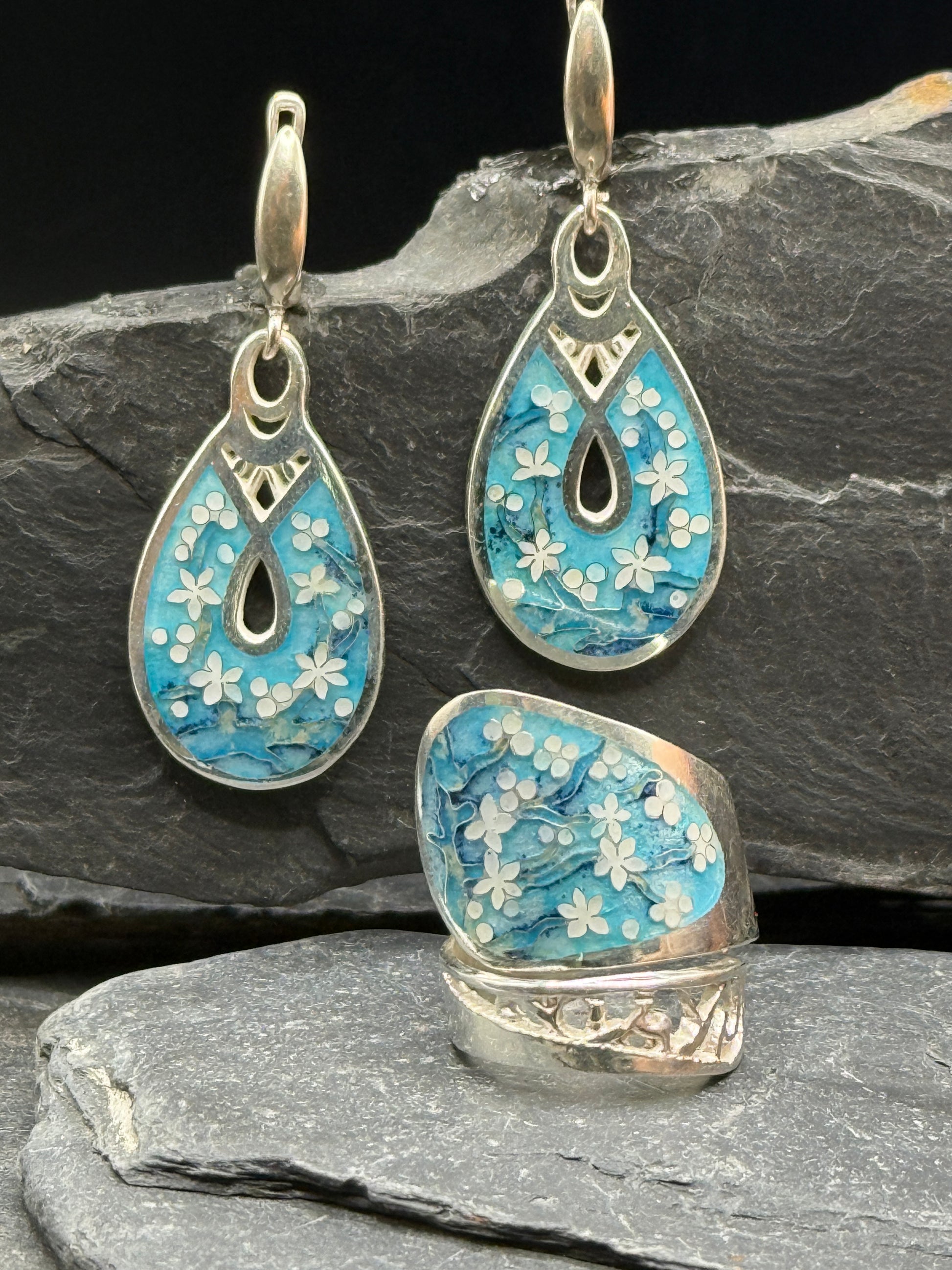 Этот изящный комплект украшений, вдохновлённый картиной Винсента Ван Гога «Цветущий миндаль» , отражает вечное видение художника – обновление и надежду. Каждый нежный лепесток вручную вылеплен из сияющей белой эмали на нежно-голубом фоне в старинной грузинской технике минанкари.