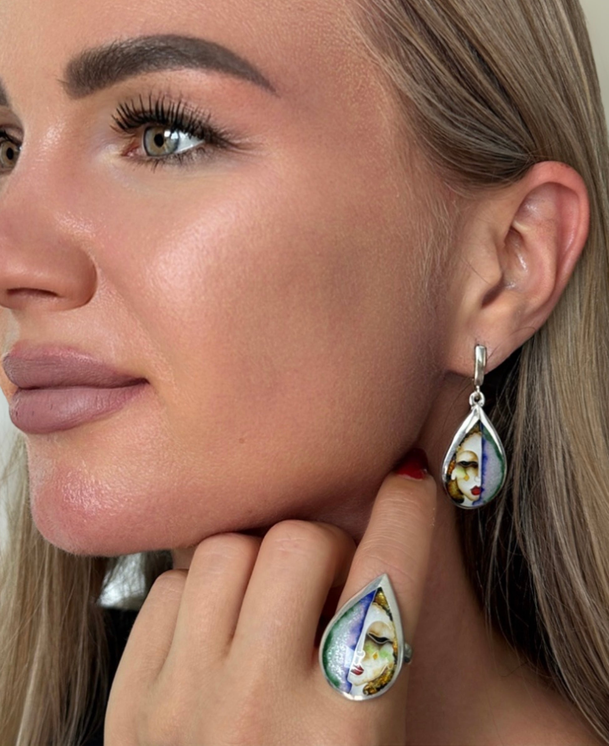 Изготовленный вручную из серебра и украшенный эмалью с использованием древней грузинской техники минанкари, этот комплект является настоящим произведением искусства, которое можно носить.