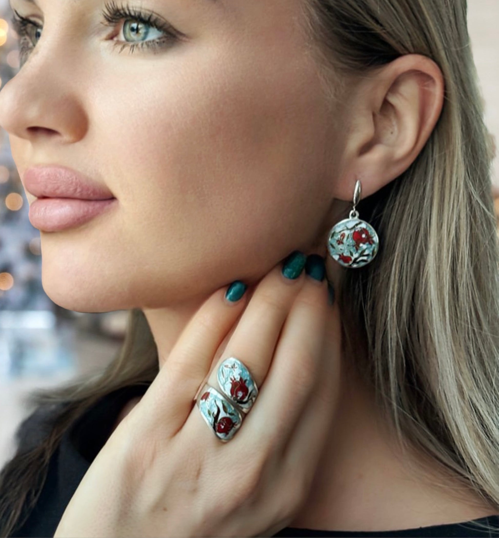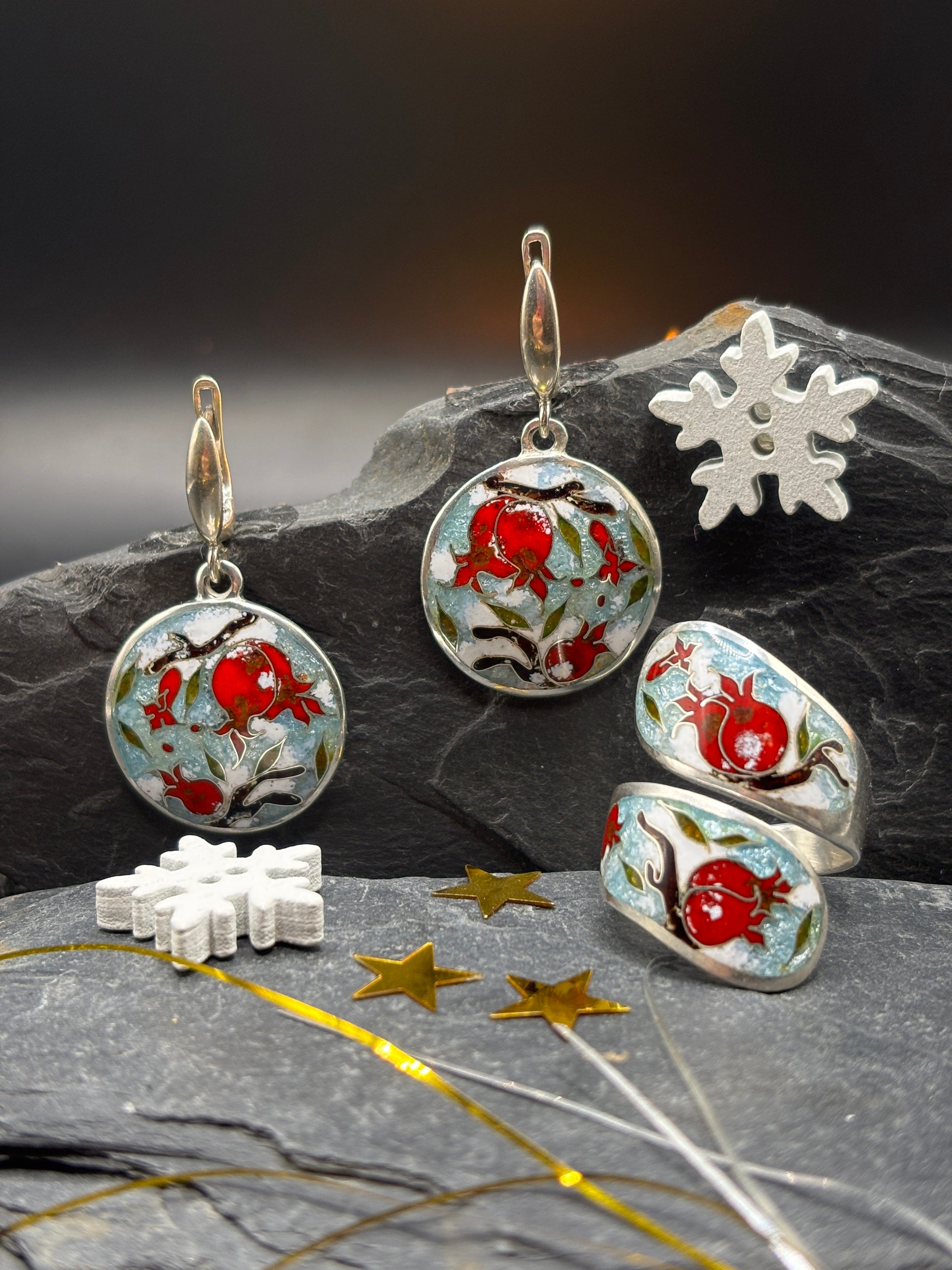 Этот уникальный набор передает магию сезона с помощью сложной эмали Минанкари. Это потрясающее празднование красоты зимы, включающее прекрасный мотив граната, припорошенный снегом. Изготовленный вручную с заботой, каждый предмет является уникальным произведением искусства, идеально подходящим для добавления нотки элегантности в вашу праздничную коллекцию.